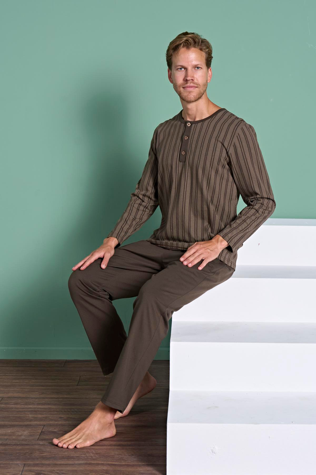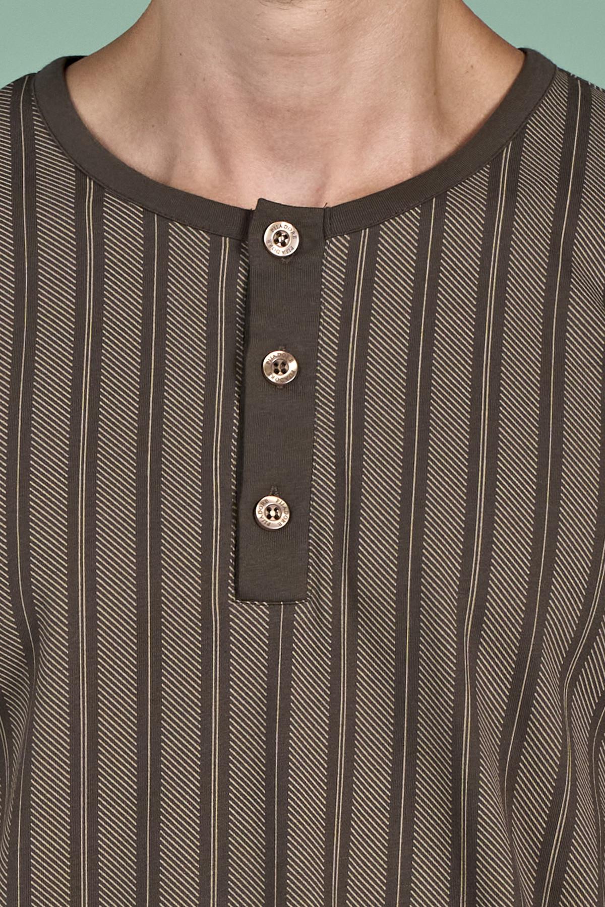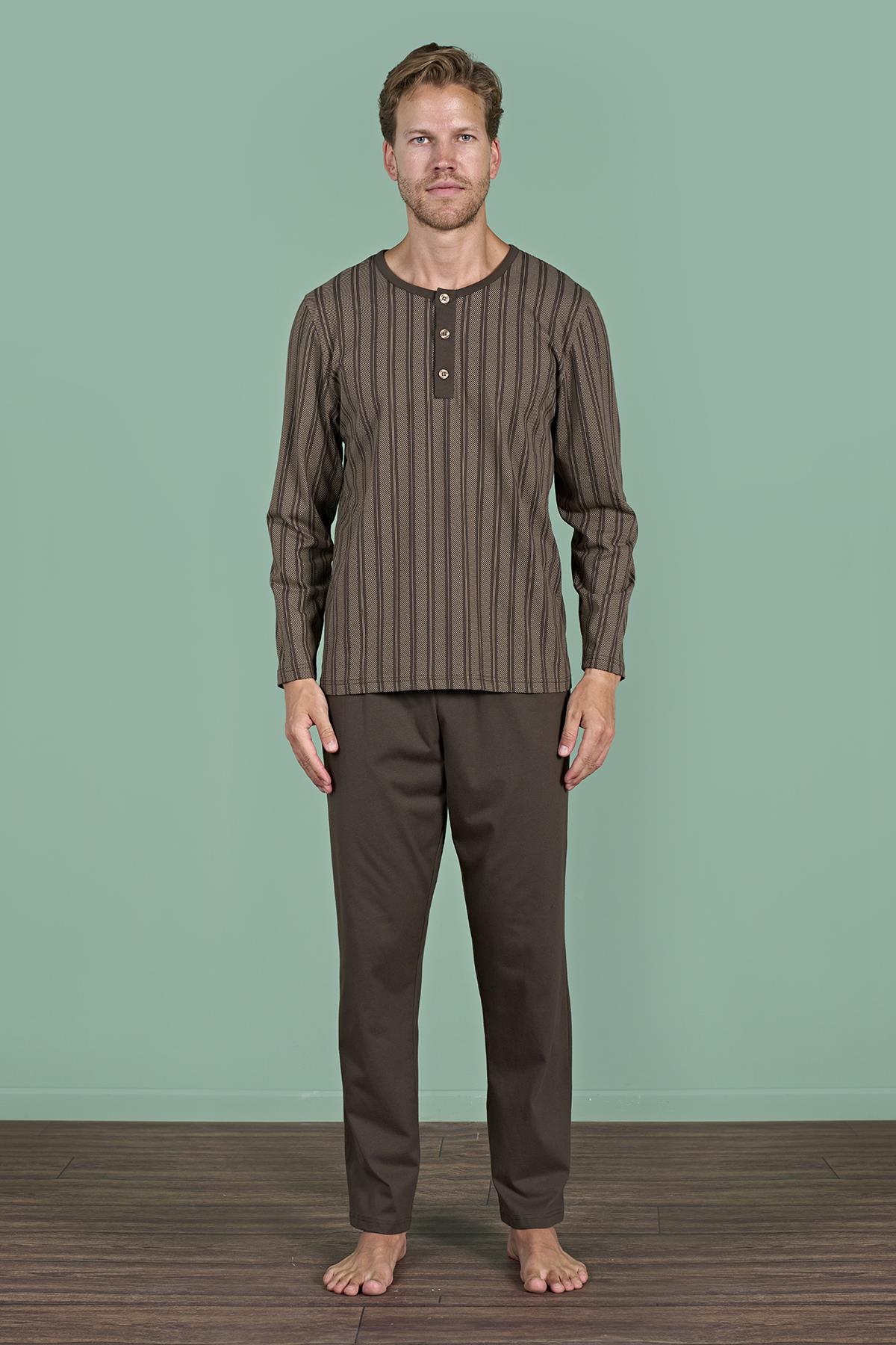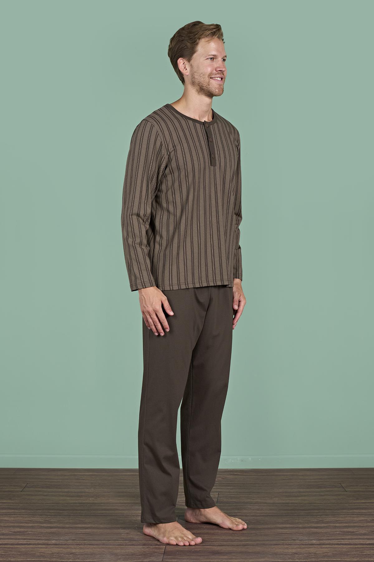 Erkek Kahverengi Çizgili Uzun Kol Pijama Takımı (OBJE 1949_KAHVE)