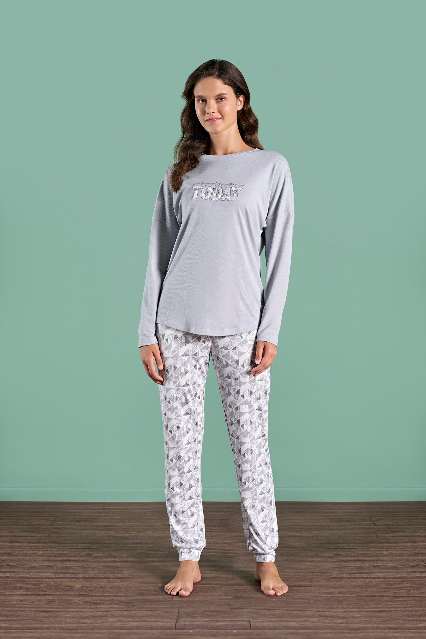 Kadın Gri Uzun Kollu Pijama Takımı (OBJE 1985_GRİ)